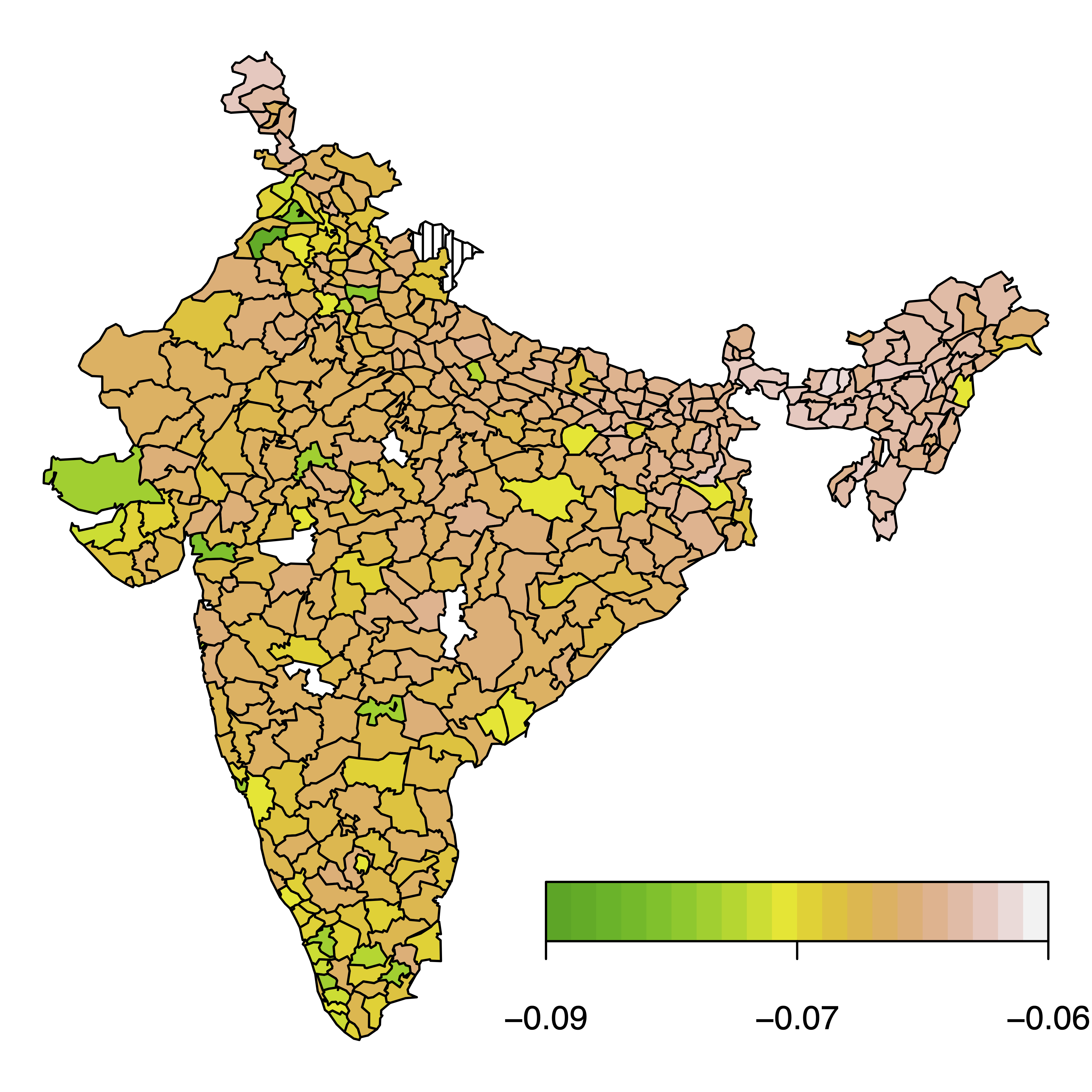 The second application is on childhood undernutrition in India using the data from [6]. We analysed the joint distribution of a binary variable (fever yes/no before survey interview) and a malnutrition indicator (wasting; low weight for height), which measures acute undernutrition. The figure below shows the estimated dependence between these outcomes expressed as Kendall’s tau and averaged by administrative area: